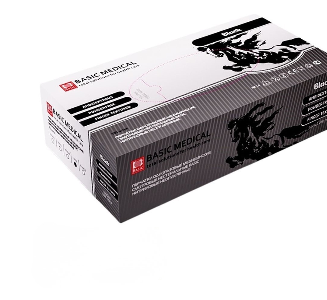 Перчатки нитриловые, ЧЕРНЫЕ, смотровые, текстур.на пальцах BASIC, 3,5гр, S (50пар) М+